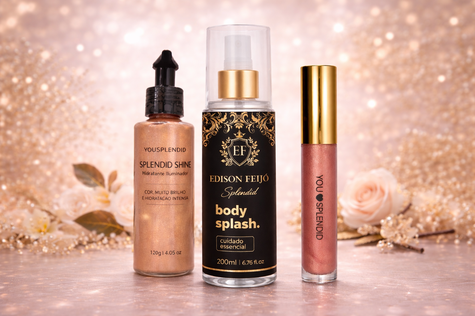 O combo que transforma presença em poder. Chegou o kit completo da elegância: fragrância marcante, brilho irresistível e acabamento perfeito, tudo em um só combo. Body Splash Edison Feijó Splendid: Perfume sofisticado que fixa na pele e deixa um rastro inesquecível. Splendid Shine Iluminador Hidratante: Pele radiante, glow intenso e hidratação que valoriza cada detalhe do seu corpo. Gloss You Splendid: Lábios volumosos, brilhantes e extremamente atraentes. • Esse não é só um combo... é um upgrade na sua imagem.Vote agora!
