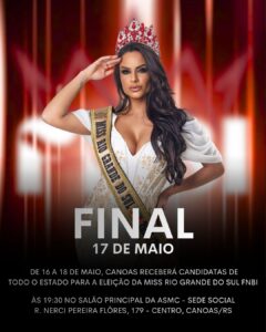 No dia 17 de maio, às 19h30, a Sede Social ASMC, em Canoas, será palco de um dos eventos mais aguardados do ano: a Grande Final do MISS RIO GRANDE DO SUL FNBI. Prepare-se para uma noite de glamour, emoção e beleza, onde candidatas de todo o estado disputarão o título que transforma vidas e abre portas para o cenário internacional. Garanta seu ingresso e viva de perto esse espetáculo inesquecível.Participantes: